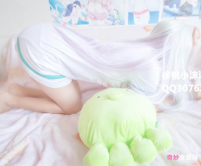 桃小沫沫酱身穿白色+粉色长T恤,犹如她的名字,非常的清爽动人,